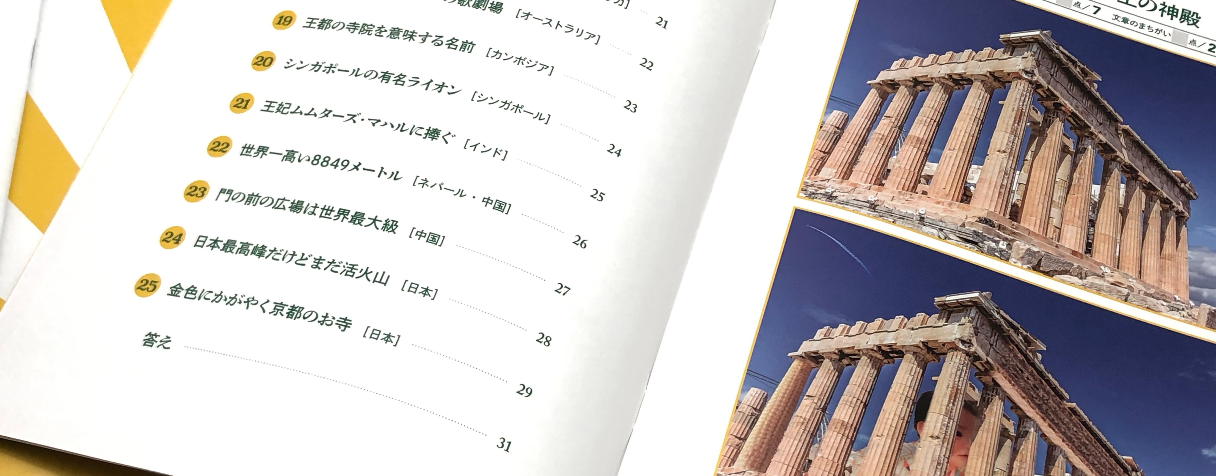 世界をめぐる旅が一冊の間違い探しに! 沖縄で満員御礼の算数をしない算数教室で開発された世界をめぐる間違い探し。世界25の名所や都市を間違い探しを通じて、楽しく学ぶことができます。間違いは、写真の間違いと文章の間違いがあります。名所を学びながら、文章の間違い探しを何度もじっくりと読むことで、読解力も身につきます。 対 象:高学年 〜 大人まで 仕 様:A4サイズ オールカラー 内 容:まちがいさがし 全25問 送 料:1000円未満 全国一律 250 円 1000円以上無料 対 象:高学年 〜 大人まで 仕 様:A4サイズ オールカラー 内 容:まちがいさがし 全25問 送 料:1〜5冊 全国一律 250 円